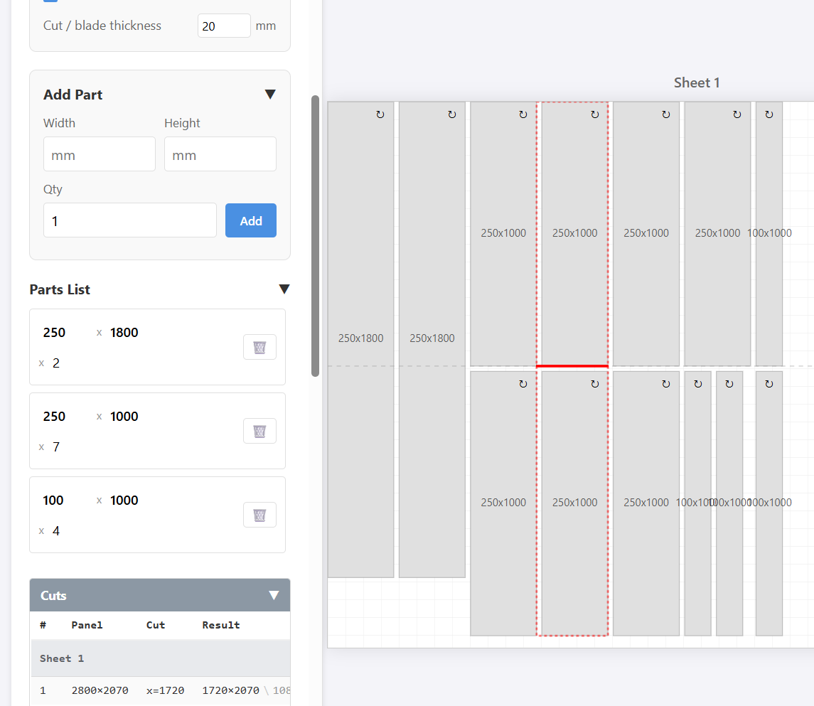In the new version of CutEase, you will see those red cut lines. The algorithm now attempts to build a logical route for your saw, merging small cuts into larger passes where possible.
